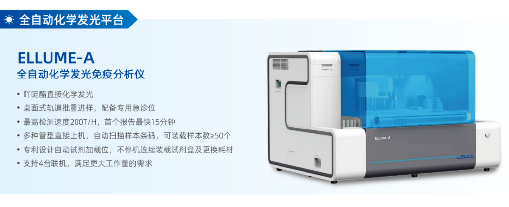 全自動高通量化學發光平臺ELLUME-A可實現200T/H的檢測速度,試劑線性范圍寬、準確度高、重復性好,檢測結果與進口品牌一致性高,可全方位提升實驗室的檢驗質量與工作效率。